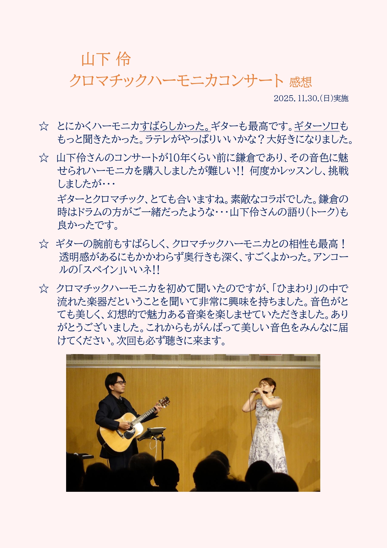 〇12月12日「事務局雑感」更新。〇「第102回教育会館ふれあいコンサート 山下伶クロマチックハーモニカコンサート」感想掲載。