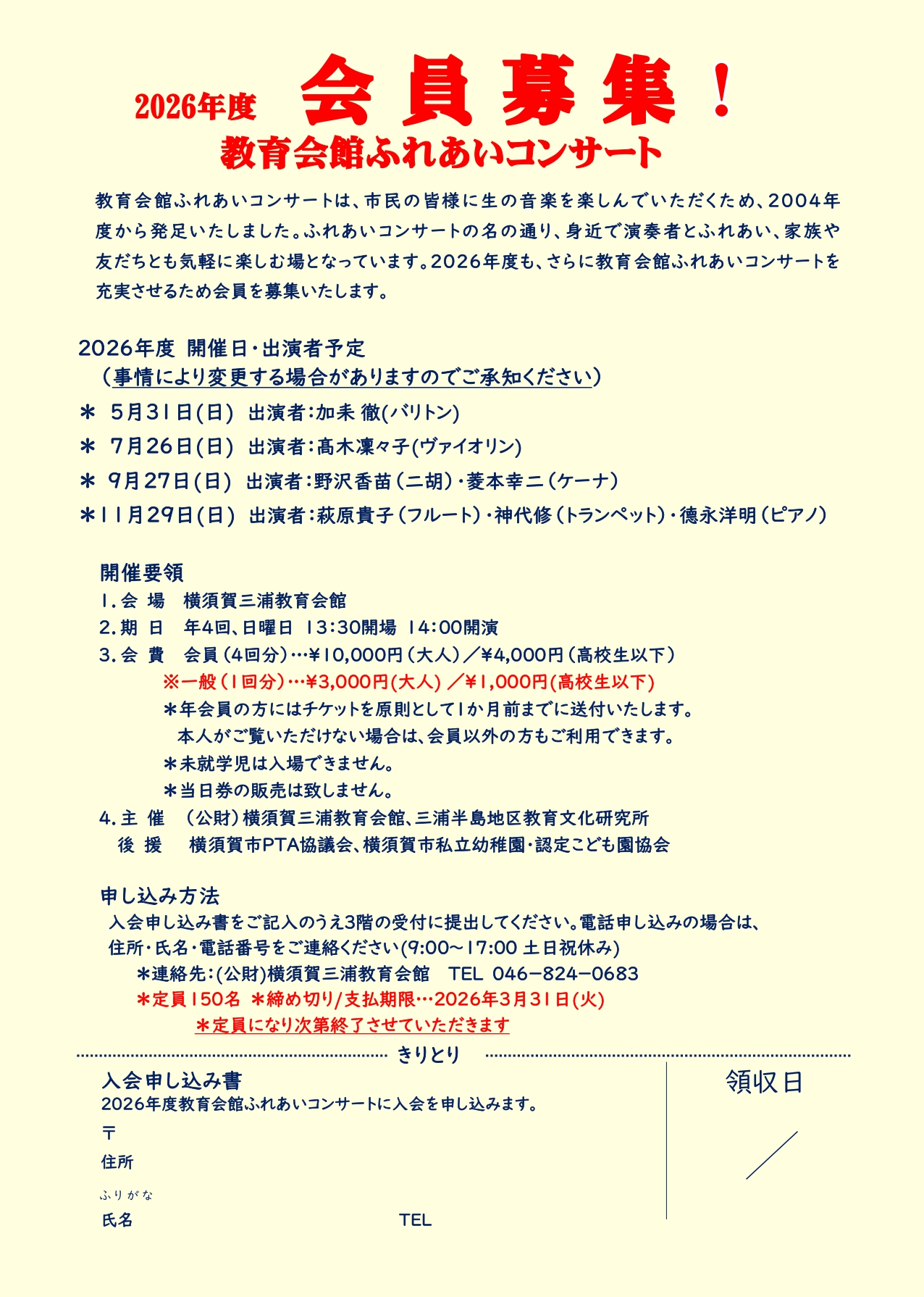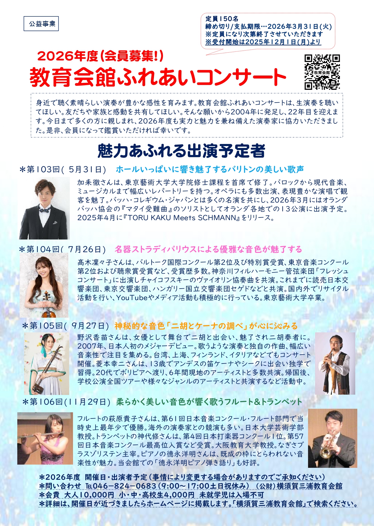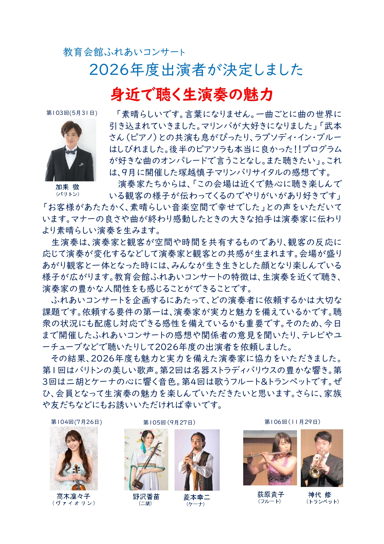 〇「第102回教育会館ふれあいコンサート 山下伶クロマチックハーモニカコンサート」お知らせ。